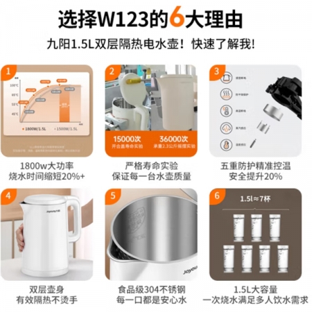 九阳 Joyoung 热水壶烧水壶电水壶 双层壶体 隔热防烫 优质温控 1.5L家用电水壶 K15FD-W123